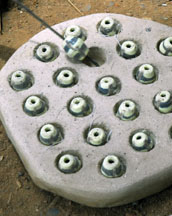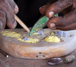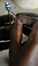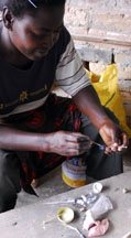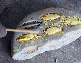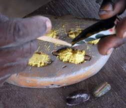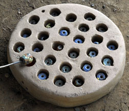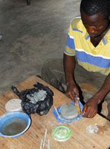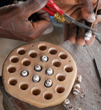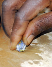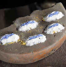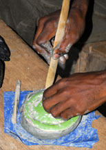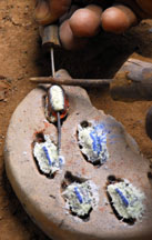 A dry cassava stem is placed in the central depression, then cut. For single colored beads, the glass powder is poured all over the mold, the mold is bumped on the side to settle the powder, then it is tilted so that the excess may be wiped off with a feather. The cassava stem will burn out during firing and form the hole.