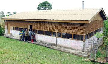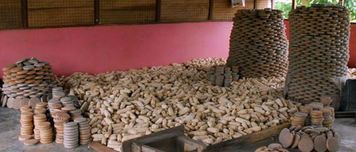 Glass windows and bottles are ground into fine powder in this mortar.  Stacks of fired clay molds wait to be filled with glass powder. They may be reused many times, even when broken.  Cassava stems, that form the holes in the beads, are harvested from plants that grow outside the studio.