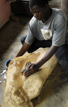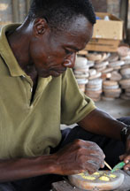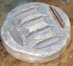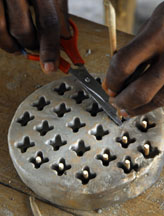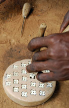 Terracotta clay is modeled into a disk, cut to size, then stamped with a shaped wooden tool (the spike secures the cassava stem). The mold will be fired to 800o to 1000o C to prepare it for bead making.
