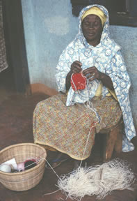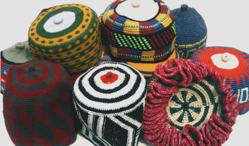 Tapestry crocheted hats are popular in West Cameroon, Africa.