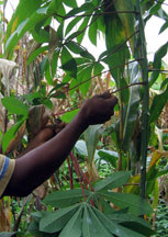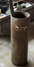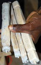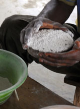 Glass windows and bottles are ground into fine powder in this mortar.  Stacks of fired clay molds wait to be filled with glass powder. They may be reused many times, even when broken.  Cassava stems, that form the holes in the beads, are harvested from plants that grow outside the studio.