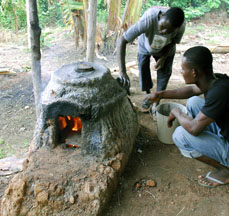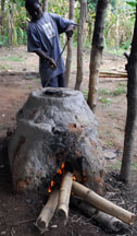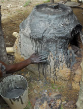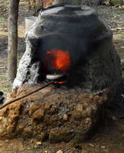 The kiln was constructed from local red clay. It was covered with a liquid clay mixture to fill in the cracks right before firing. The filled molds were put in the kiln, the kiln was heated for 10 minutes, more fuel was added, the molds were fired for 20 to 35 minutes at 600o to 800o C until the glass powder melted, then the molds were removed from the kiln to cool.