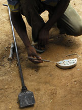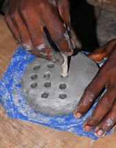 Terracotta clay is modeled into a disk, cut to size, then stamped with a shaped wooden tool (the spike secures the cassava stem). The mold will be fired to 800o to 1000o C to prepare it for bead making.