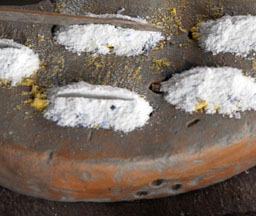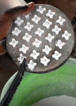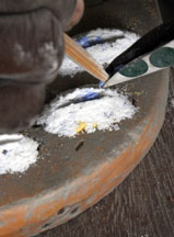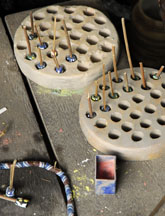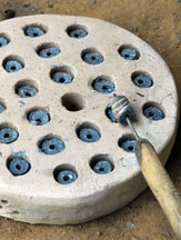 A dry cassava stem is placed in the central depression, then cut. For single colored beads, the glass powder is poured all over the mold, the mold is bumped on the side to settle the powder, then it is tilted so that the excess may be wiped off with a feather. The cassava stem will burn out during firing and form the hole.