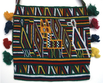 Shoulder bags are crocheted by both men and women in Guatemala.